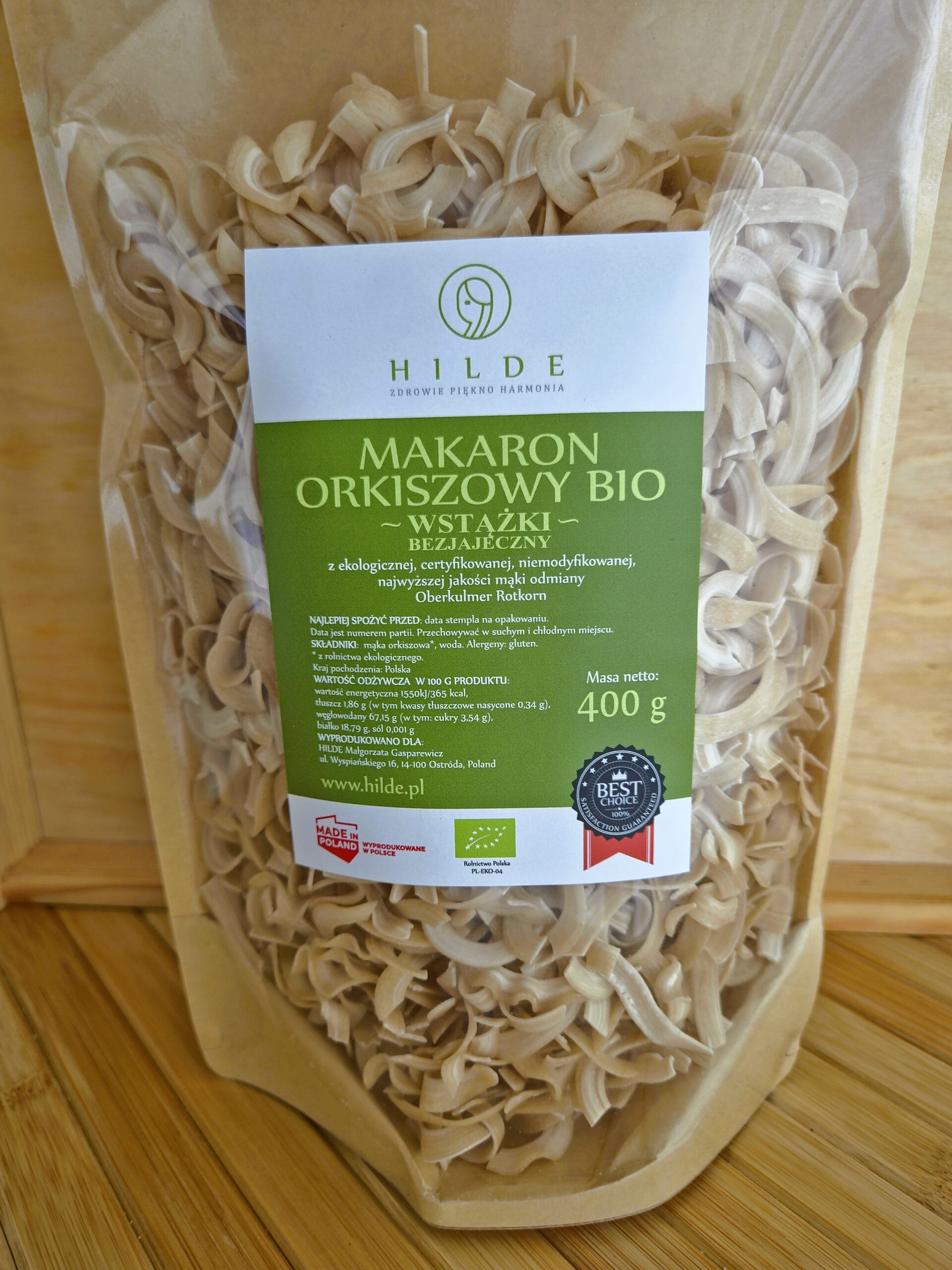 makarony orkiszowe BIO – wytwarzane dodatkowo w certyfikowanym zakładzie, co potwierdza znak zielonego listka na opakowaniu.
